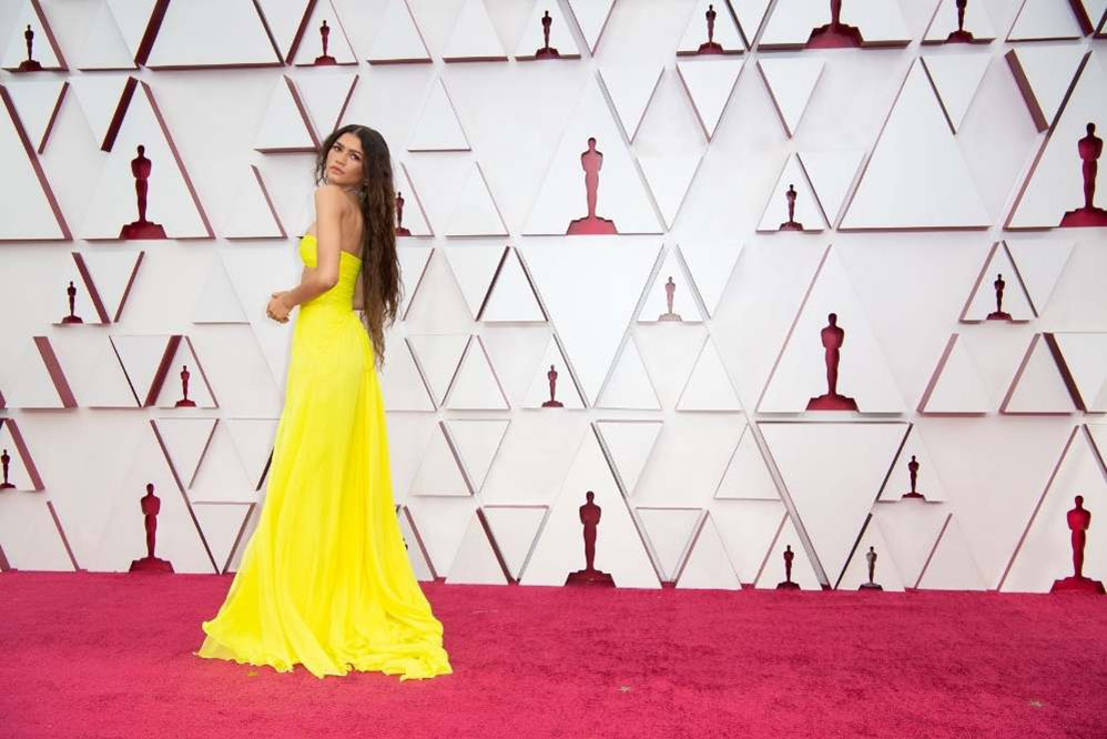 A atriz arrasou com um vestido amarelo de alças, com um belo recorte na barriga, criado pela gife Valentino. Além disso, a jovem utilizou diversas jóias da Bulgari para compor o look. Ela foi um dos grandes destaques do Oscar 2021.